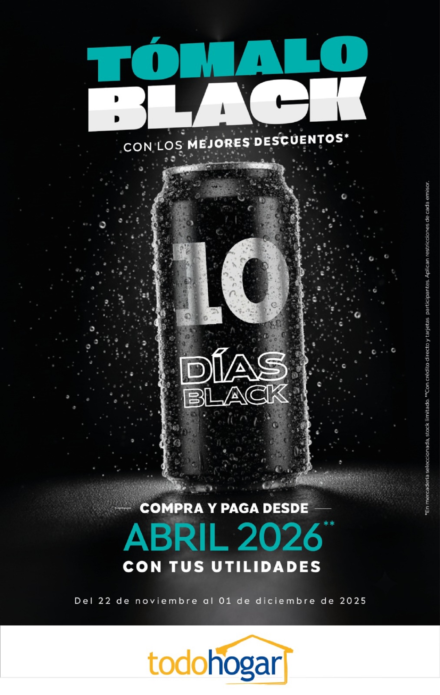 Todohogar presenta su campaña de Black Friday con 10 días consecutivos de promociones, diseñados para que las familias puedan comprar todos tus regalos Navideños, sin correr, sin filas y sin el caos típico de la temporada, y empezar a pagar desde abril con tus utilidades. La campaña “Tómalo Black” estará vigente del 22 de noviembre al 1 de diciembre de 2025 en todas las tiendas a nivel nacional.