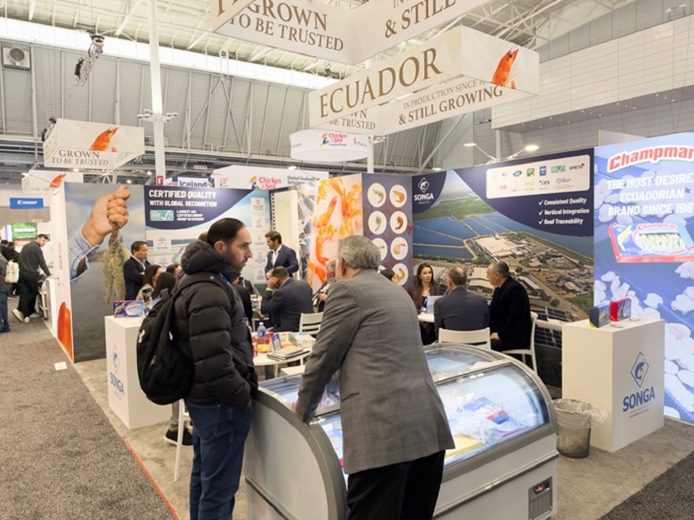 Bajo la marca Ecuador First Class Shrimp (EFCS), el pabellón presentó al mercado norteamericano los atributos que distinguen al camarón ecuatoriano a nivel mundial: calidad, trazabilidad, sostenibilidad y buenas prácticas ambientales y sociales. Esta participación conjunta reforzó la visibilidad del sector y proyectó una sólida imagen como país en uno de los encuentros más importantes de la industria global de productos del mar.